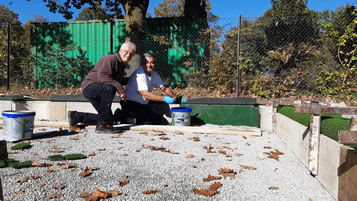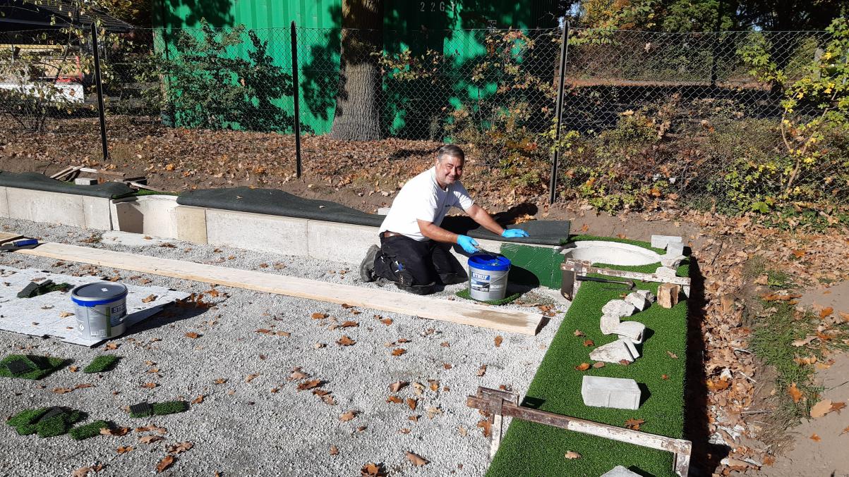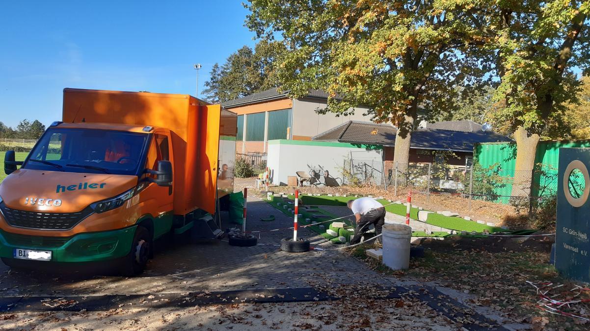 Und dann - welch ein Wetterglück - kam am 18ten und 19ten Oktober mit der Sonne auch Oleg Jenna mit dem Heiler Kunstrasen LKW. Wir konnten beide ein schaffensreiches Teamwork-Wochenende erleben, um dieses Projekt zu einem gelungenen Abschluß bringen zu können. Für Oleg war es eine gänzlich neue Erfahrung, denn bisher hat es im Sportstätten Bau von Fa. Heiler so eine Fußball-Billard-Anlage noch nicht gegeben. Wir beide strahlten mit der Sonne um die Wette dass die Arbeiten gut voran kamen.