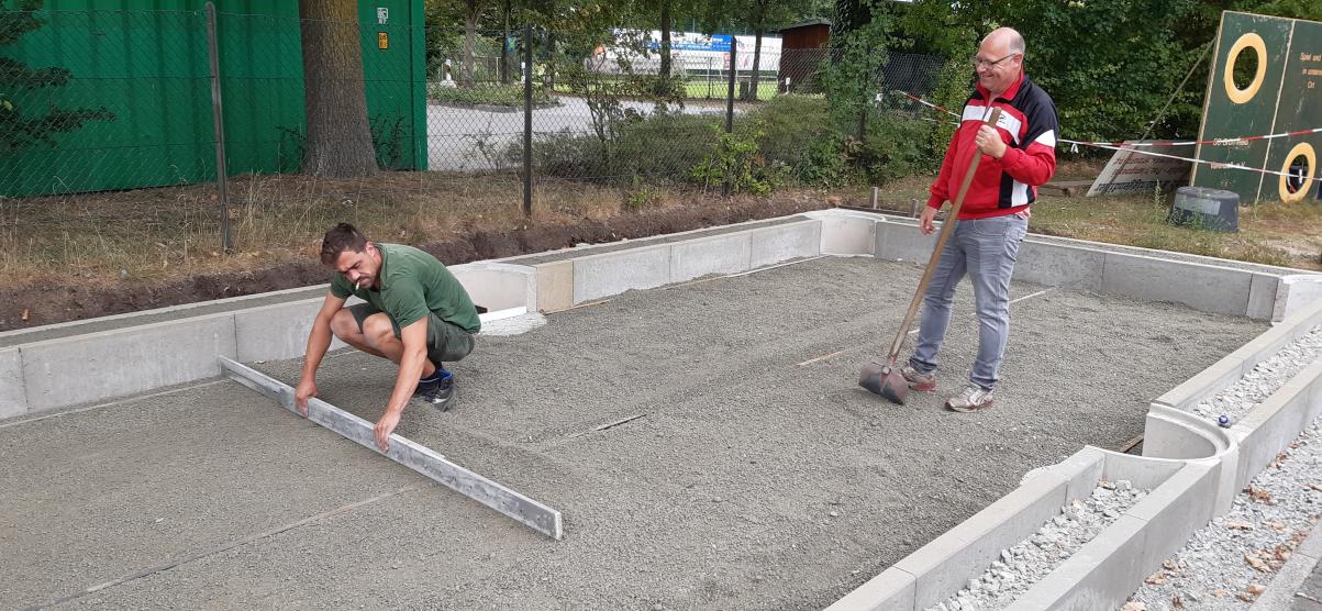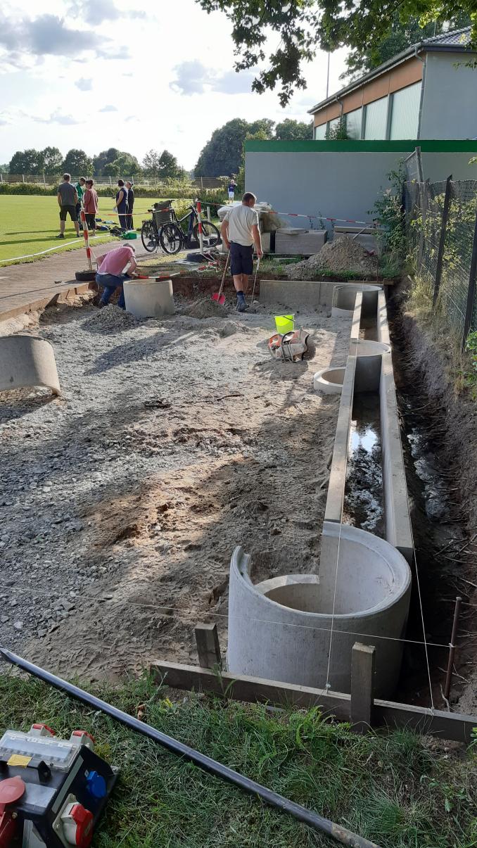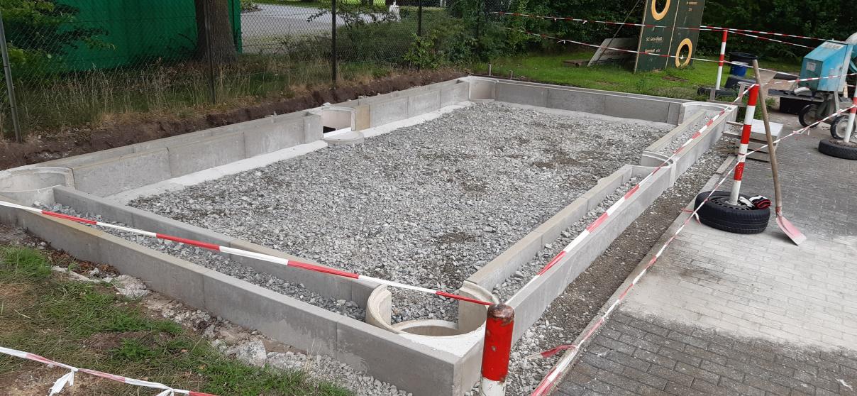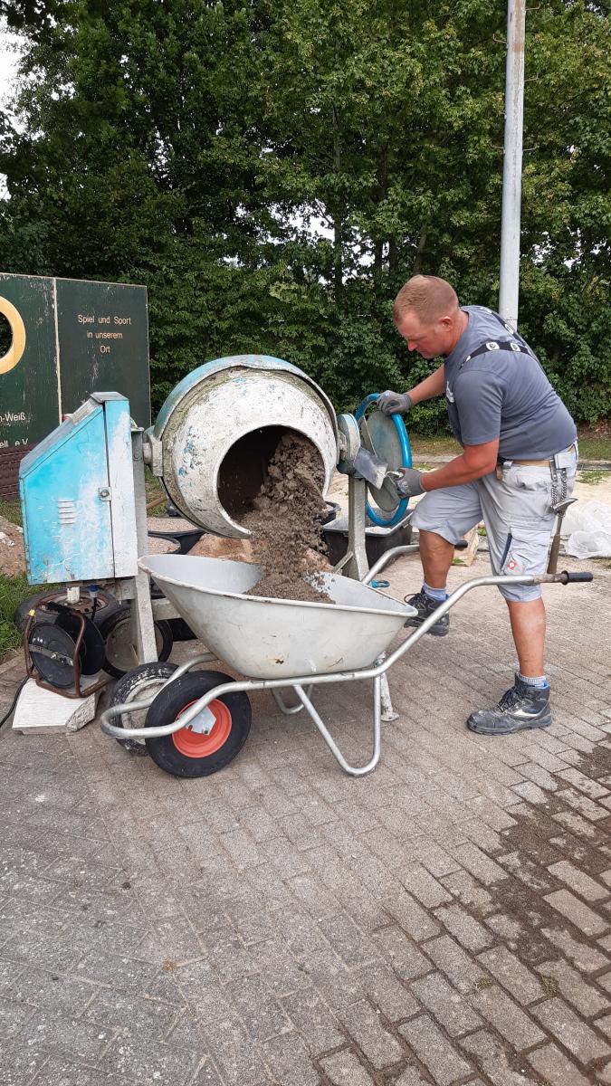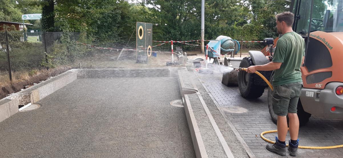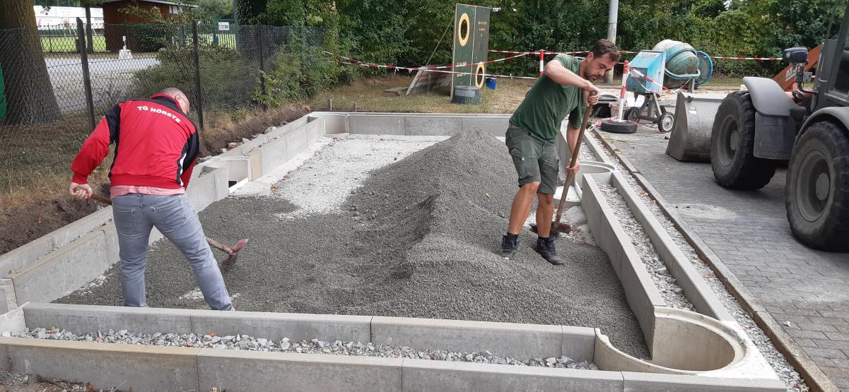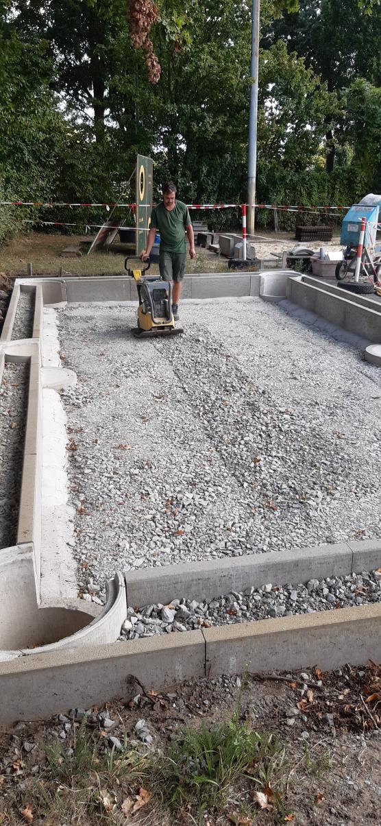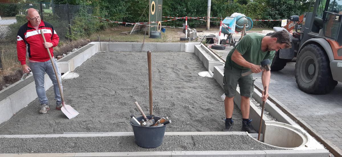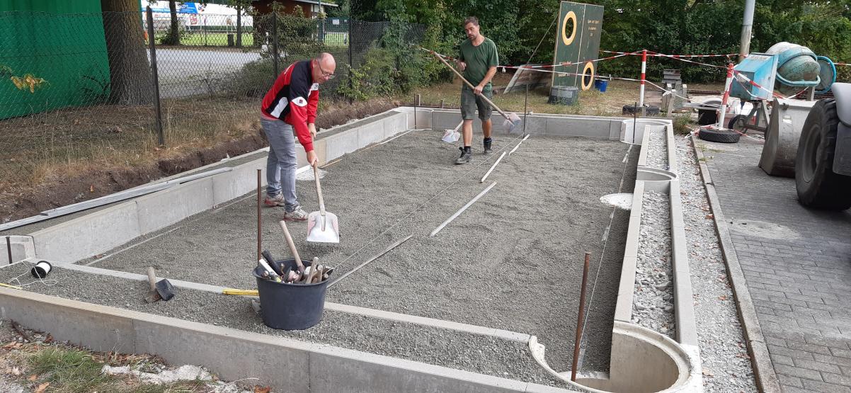 Schritt für Schritt konnten sich nun alle vorstellen, wie es fertig aussehen würde. So begonnen am 21. August die Vorbereitungen zum Auftragen des Drainage Betons: Lars Jakobfeuerborn kam mit seinem Rüttler zum Einsatz. Und Tags drauf kam der große Betonmischer von Emsland Beton zum Sportplatz.