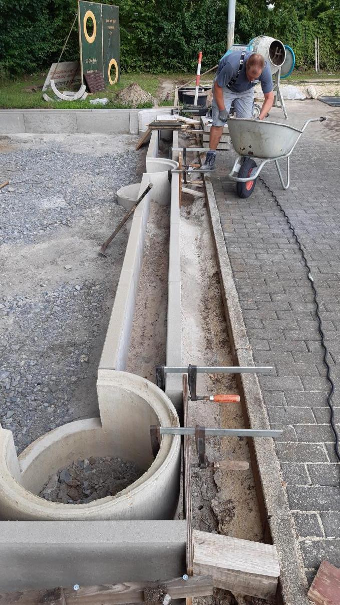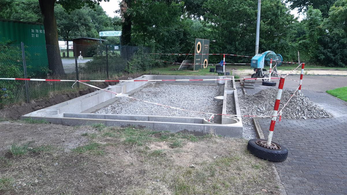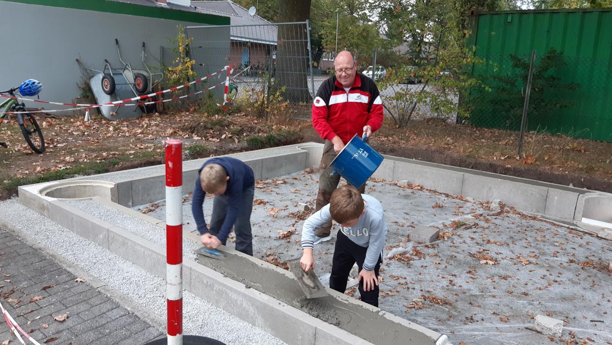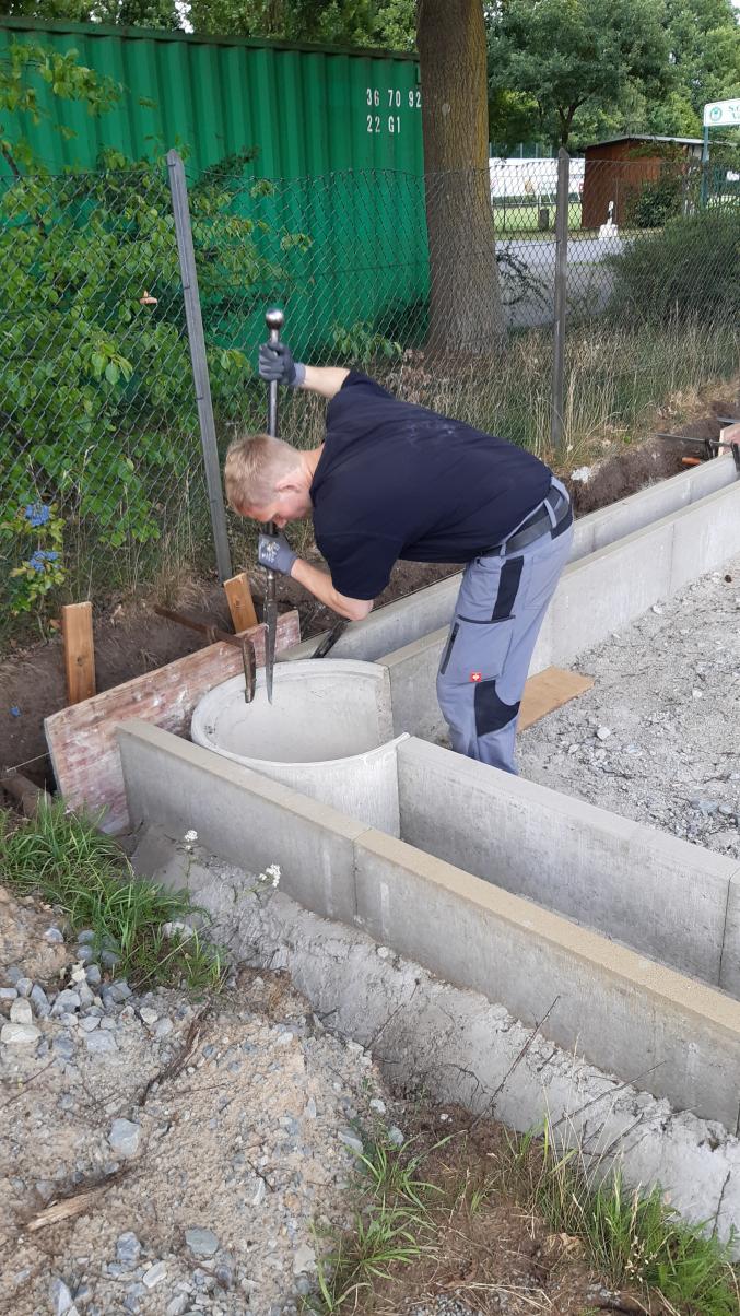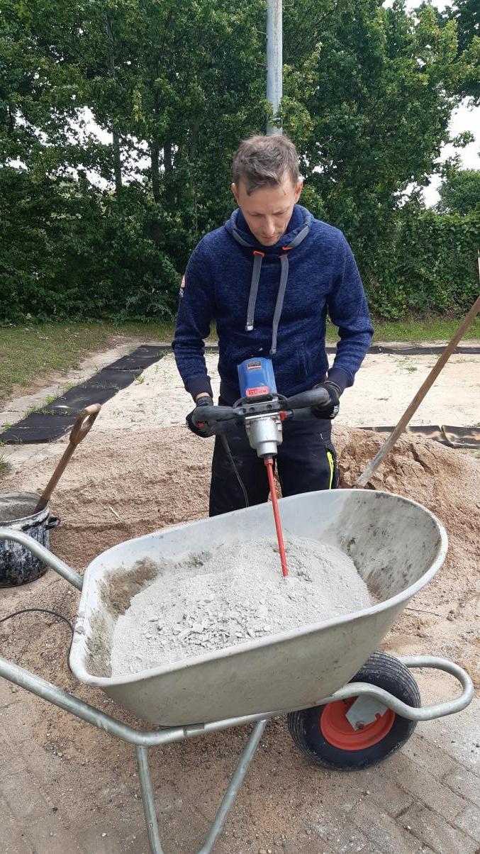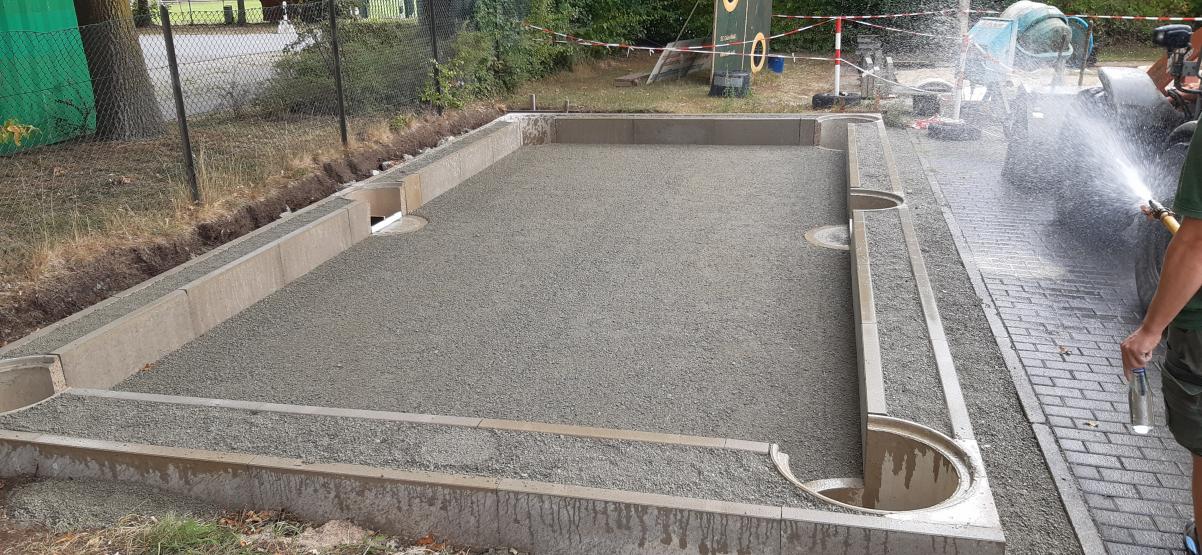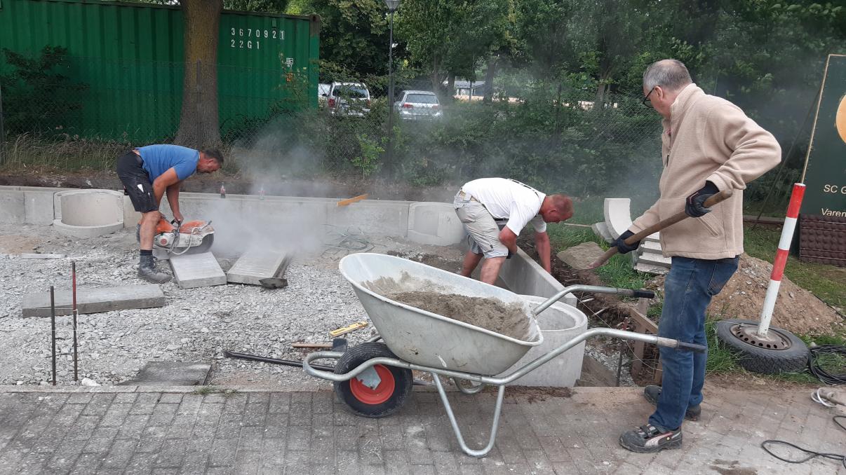Schritt für Schritt konnten sich nun alle vorstellen, wie es fertig aussehen würde. So begonnen am 21. August die Vorbereitungen zum Auftragen des Drainage Betons: Lars Jakobfeuerborn kam mit seinem Rüttler zum Einsatz. Und Tags drauf kam der große Betonmischer von Emsland Beton zum Sportplatz.
