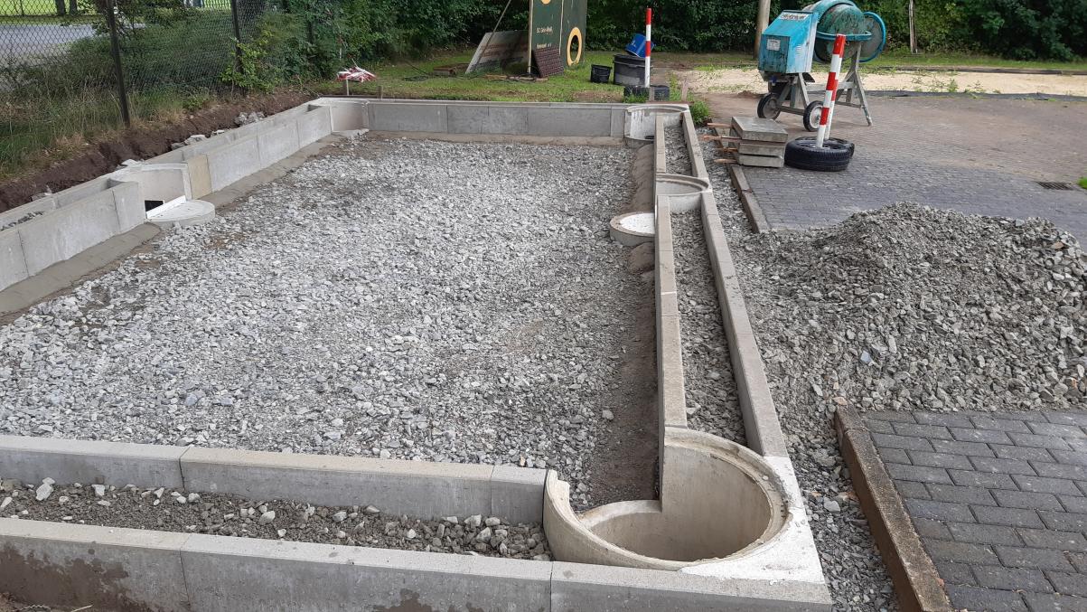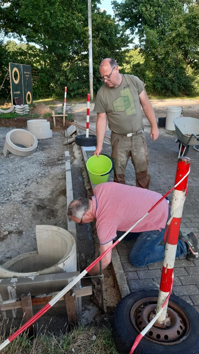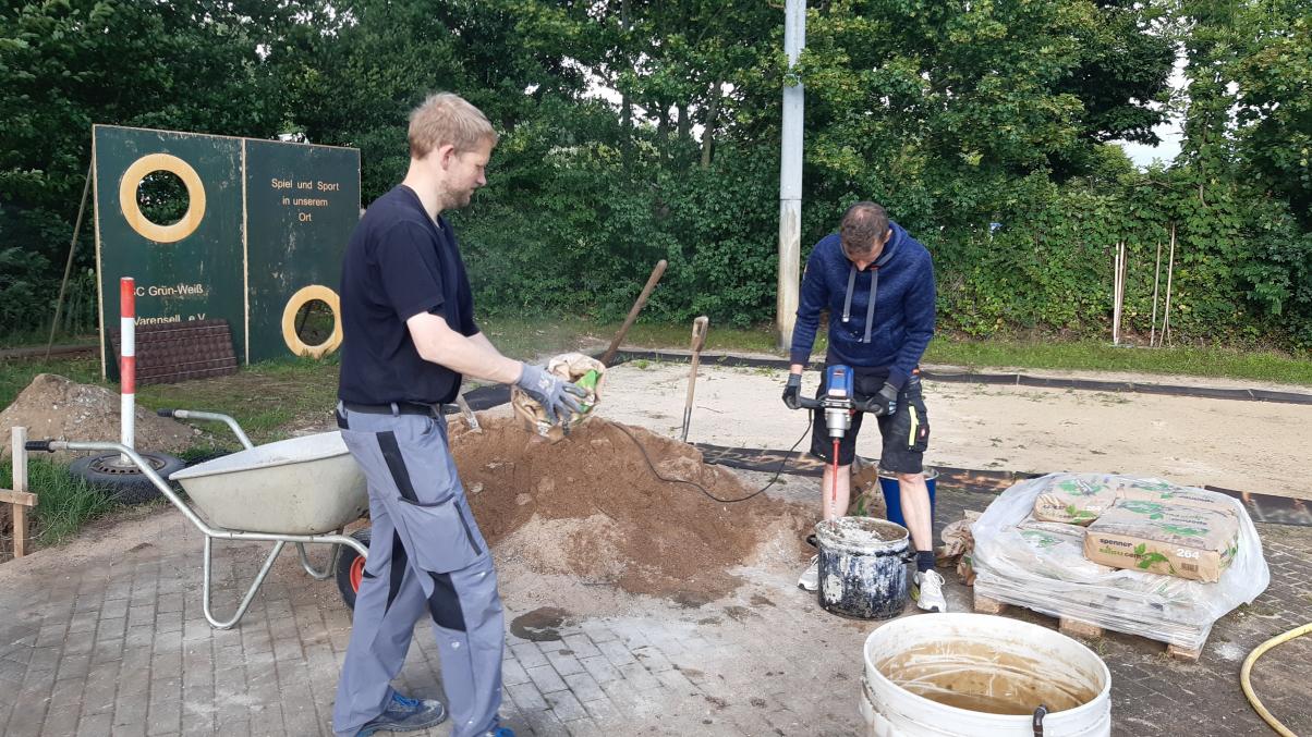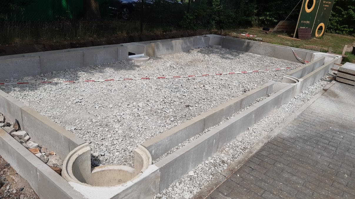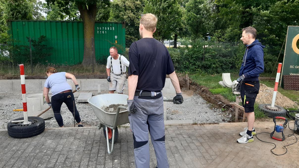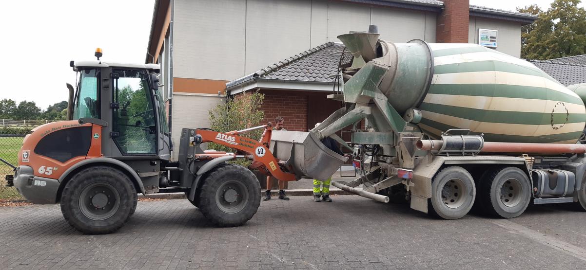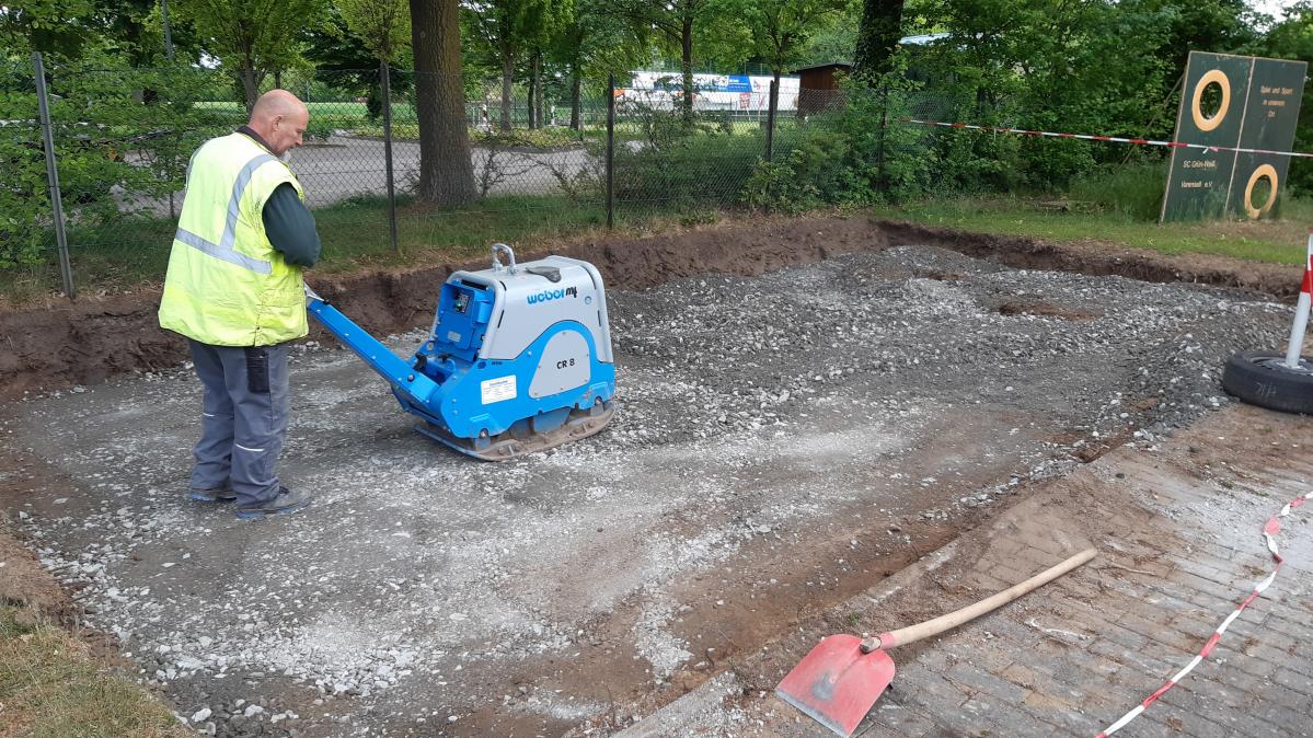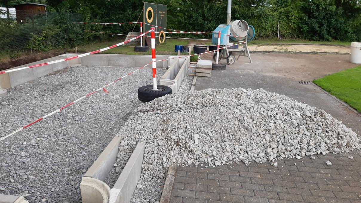 Schritt für Schritt konnten sich nun alle vorstellen, wie es fertig aussehen würde. So begonnen am 21. August die Vorbereitungen zum Auftragen des Drainage Betons: Lars Jakobfeuerborn kam mit seinem Rüttler zum Einsatz. Und Tags drauf kam der große Betonmischer von Emsland Beton zum Sportplatz.