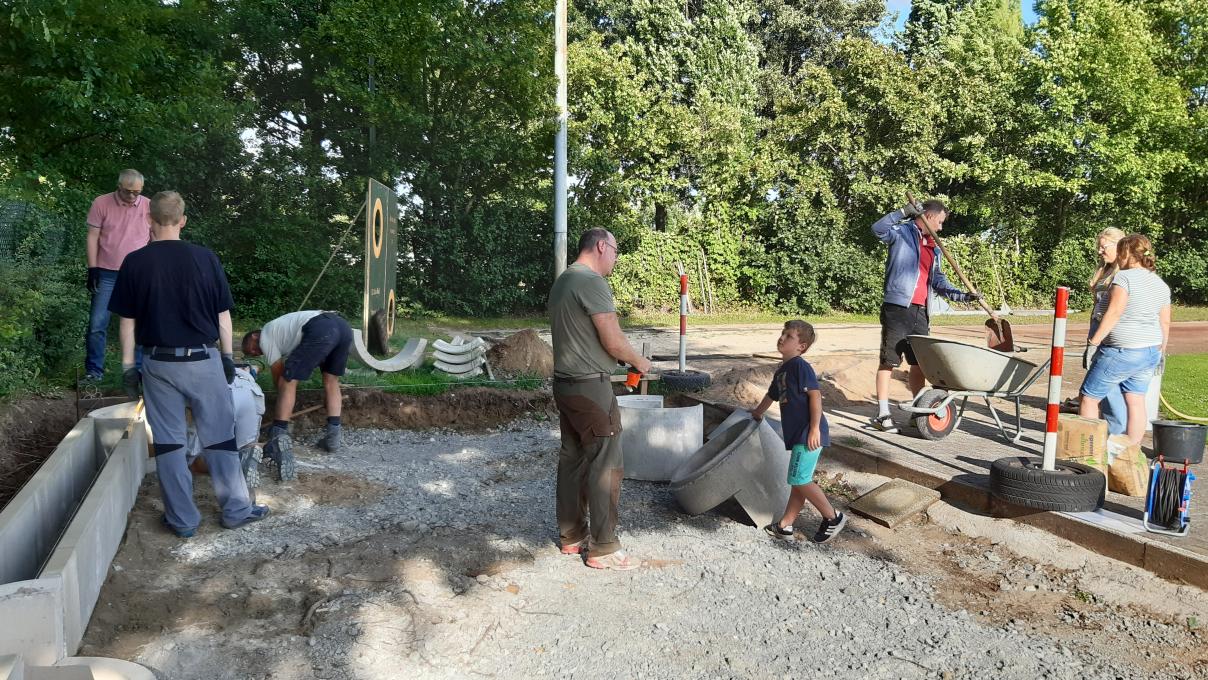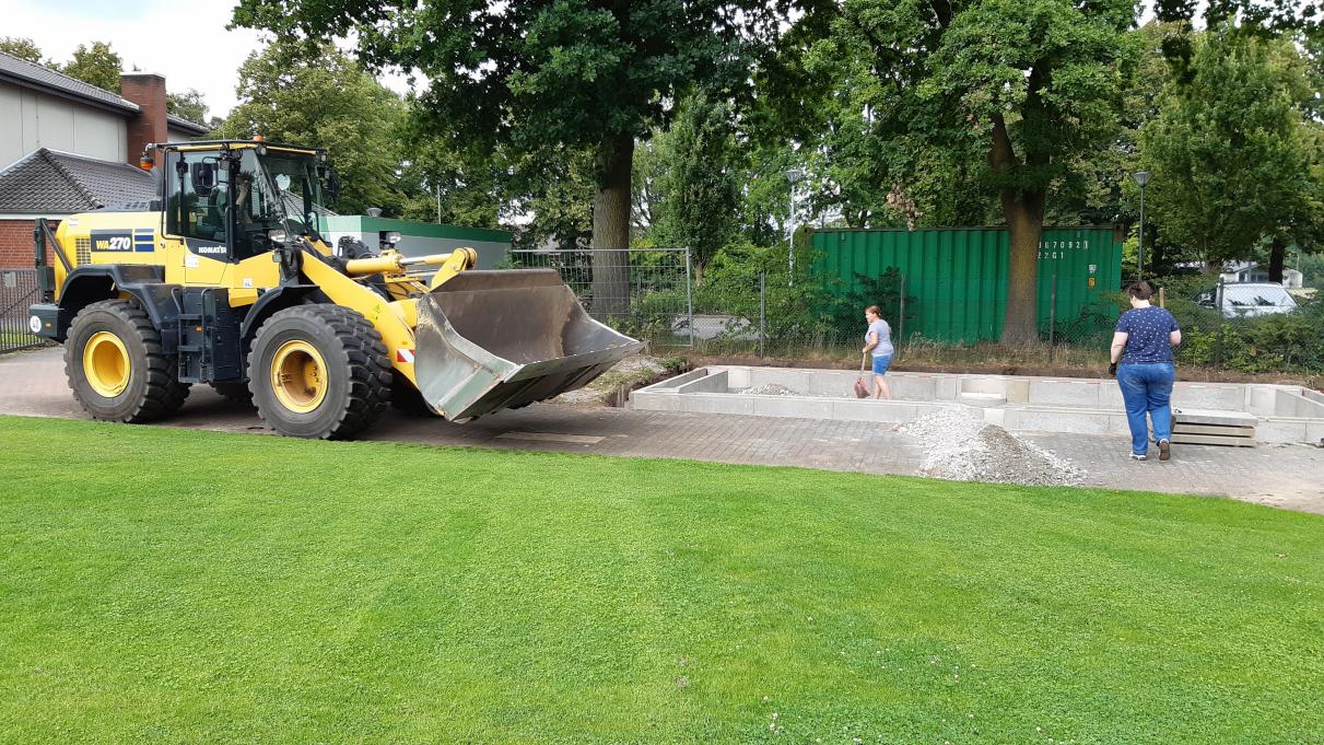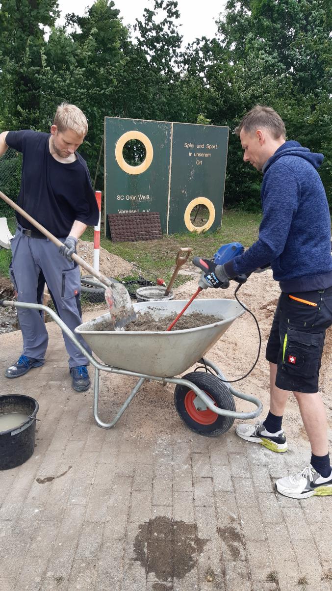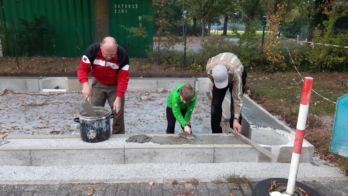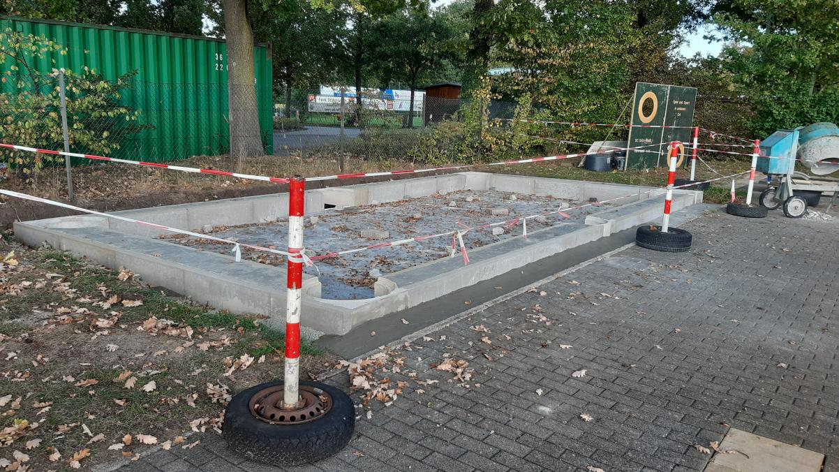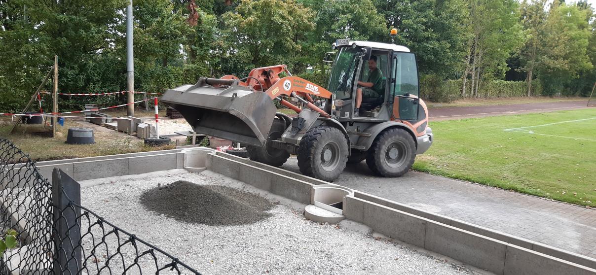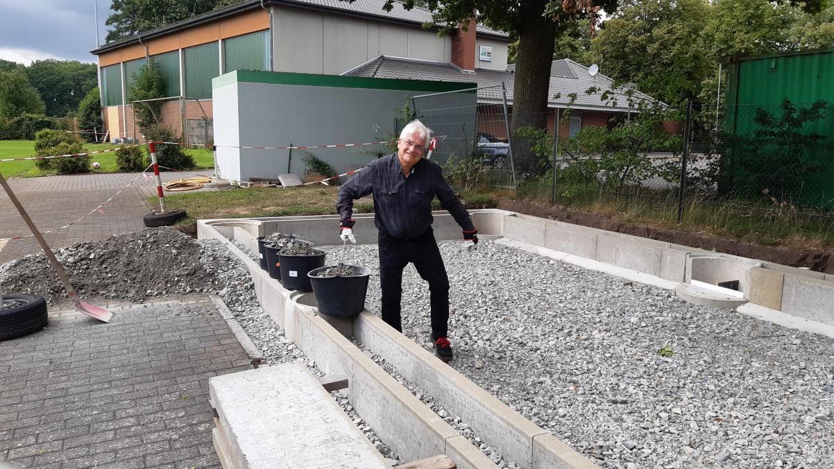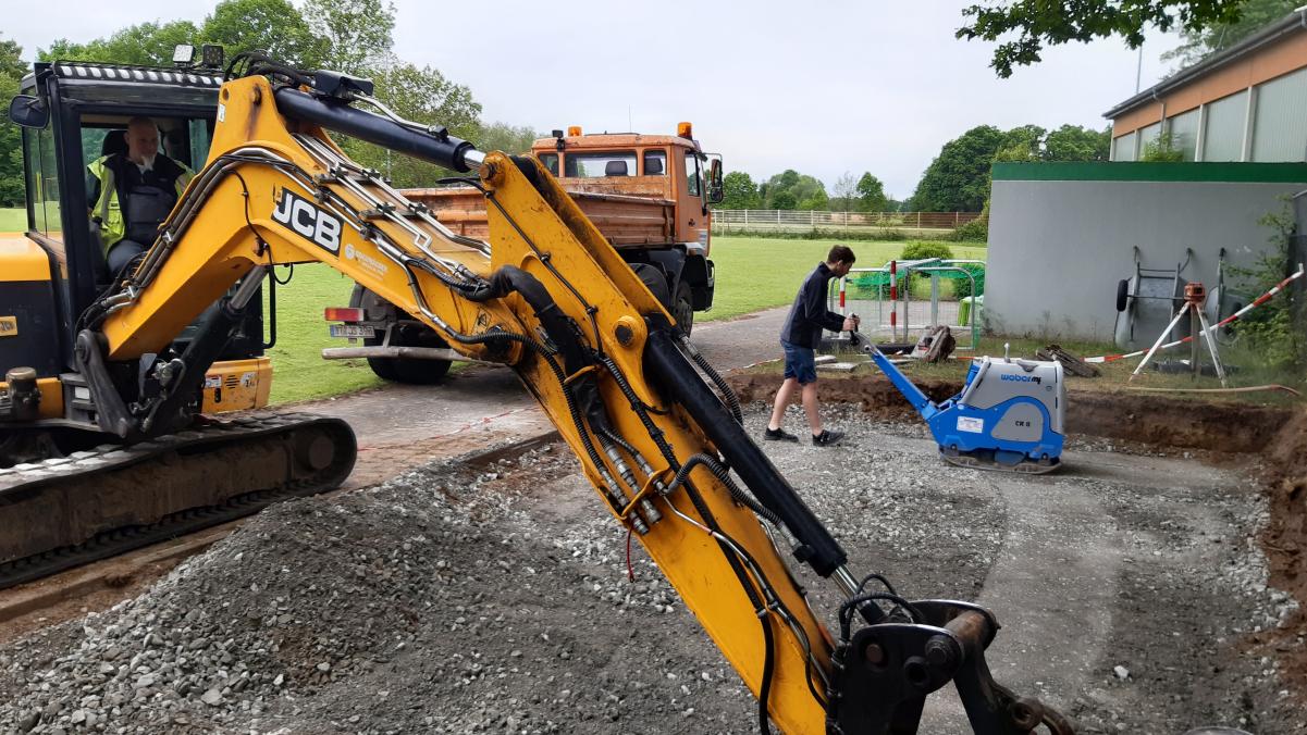 Schritt für Schritt konnten sich nun alle vorstellen, wie es fertig aussehen würde. So begonnen am 21. August die Vorbereitungen zum Auftragen des Drainage Betons: Lars Jakobfeuerborn kam mit seinem Rüttler zum Einsatz. Und Tags drauf kam der große Betonmischer von Emsland Beton zum Sportplatz.