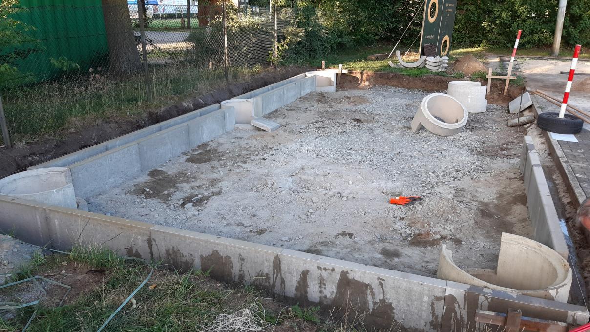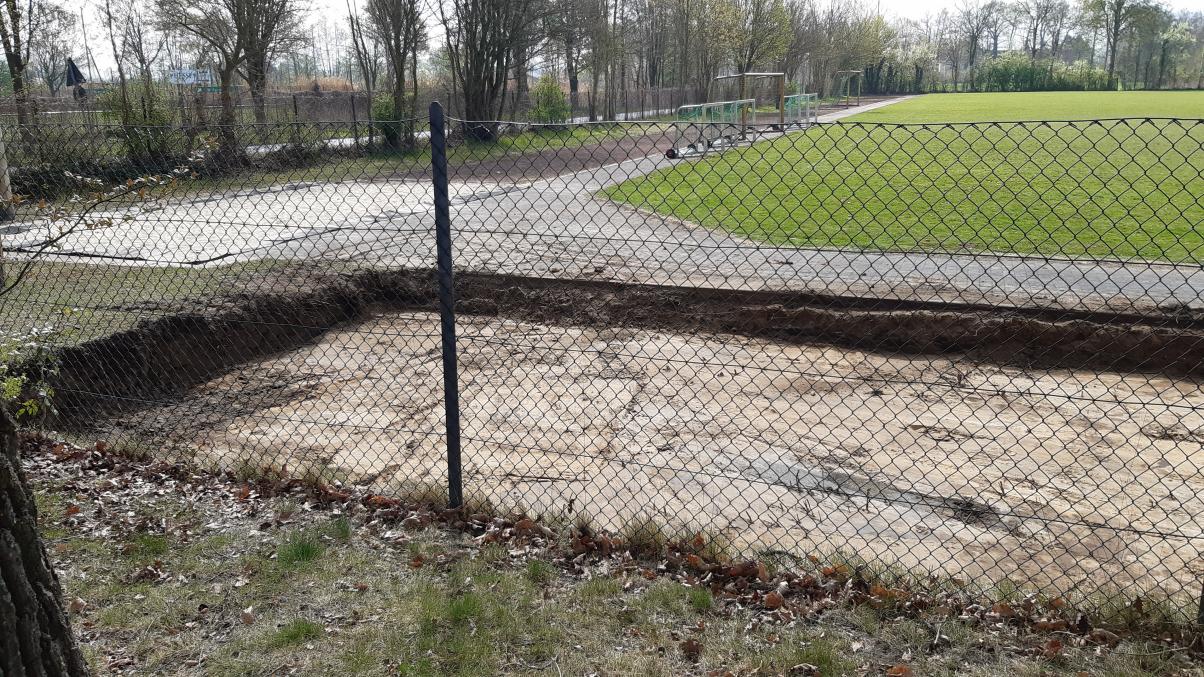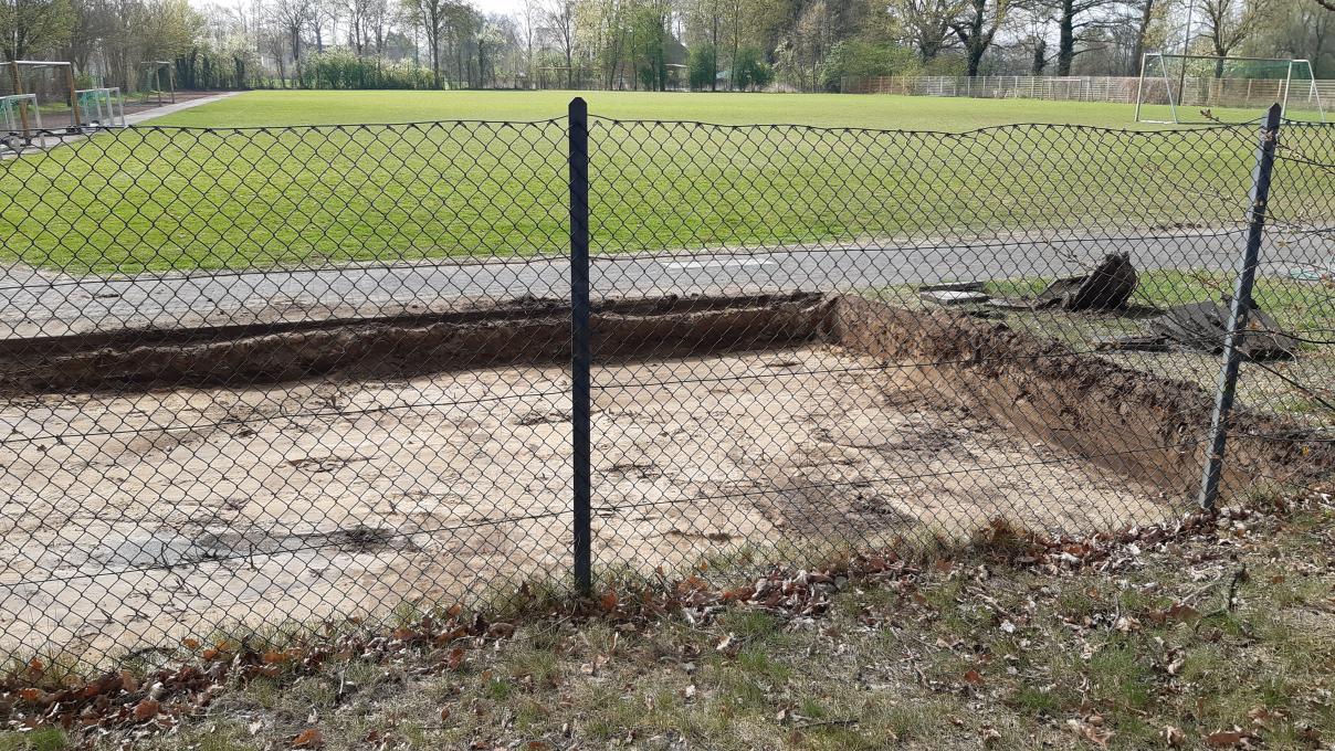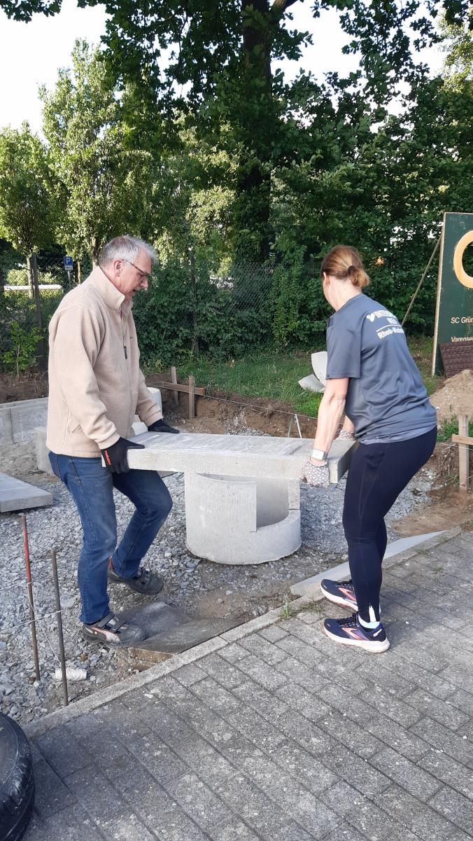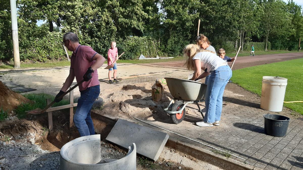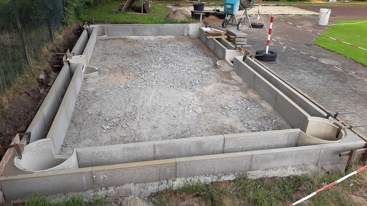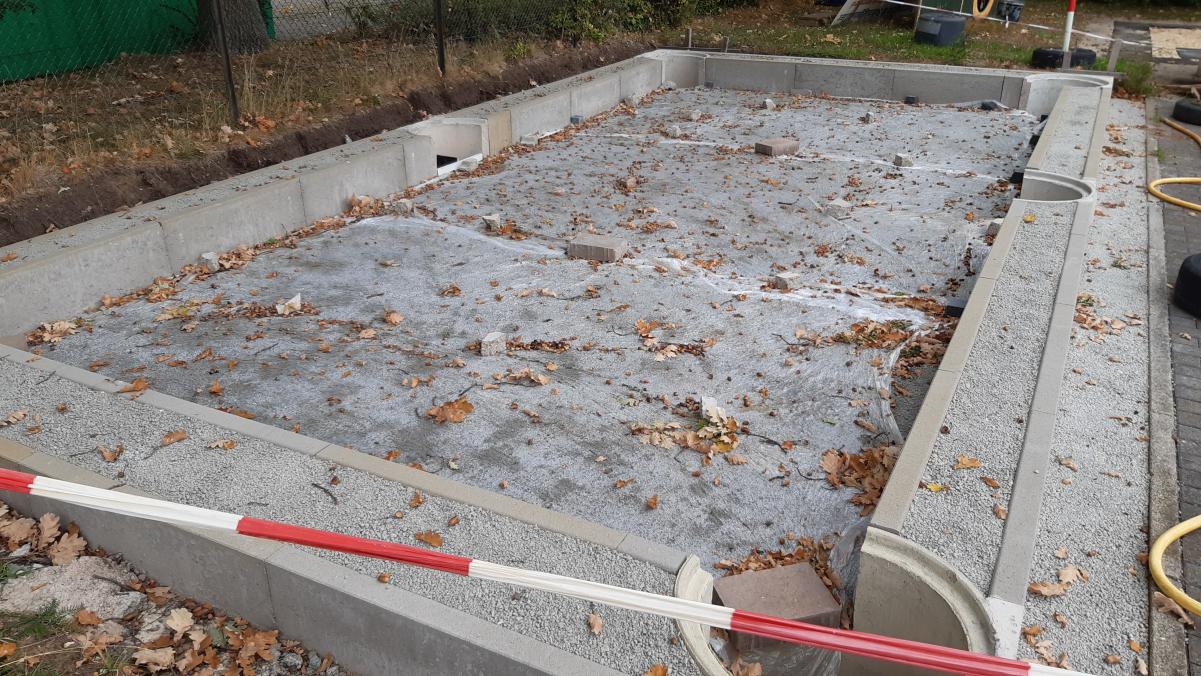 Schritt für Schritt konnten sich nun alle vorstellen, wie es fertig aussehen würde. So begonnen am 21. August die Vorbereitungen zum Auftragen des Drainage Betons: Lars Jakobfeuerborn kam mit seinem Rüttler zum Einsatz. Und Tags drauf kam der große Betonmischer von Emsland Beton zum Sportplatz.
