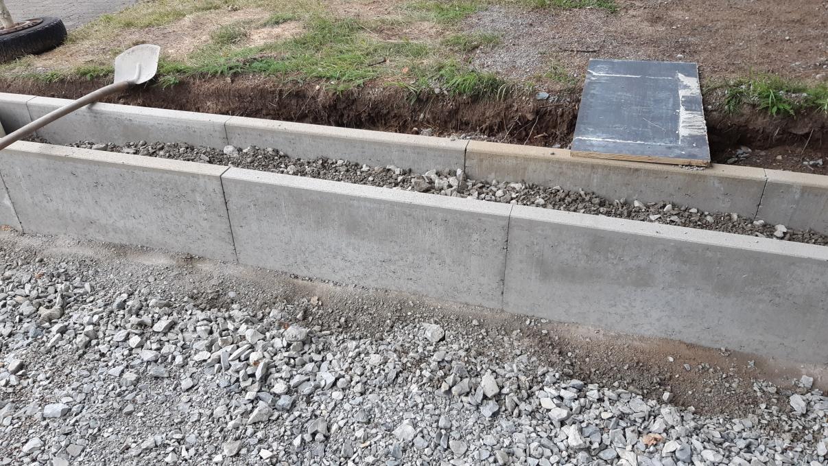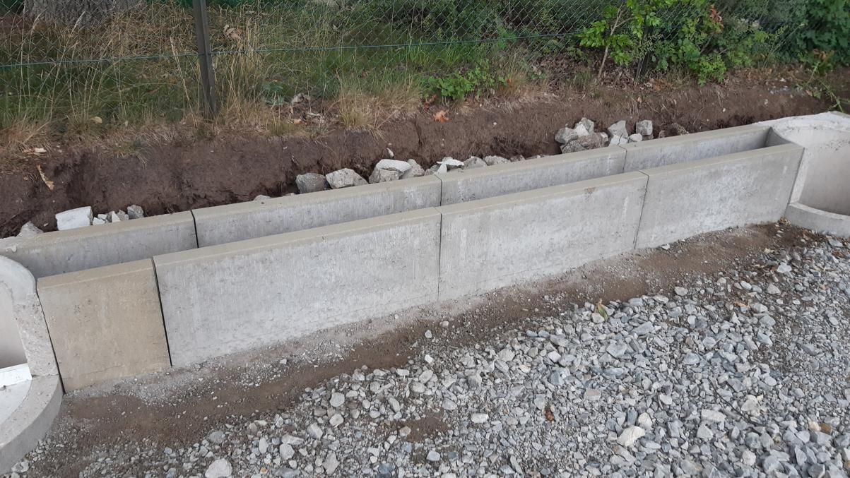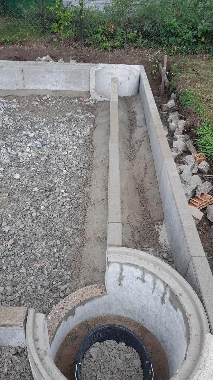 Aber beim Befüllen der ersten Rinne mit Schotter traten plötzlich lockere Kantensteine zu Tage. So wurden wir Mitte Juli etwas im Handlungsfluss gestört, benötigten nochmal frischen Zement und Sand, um zusätzliche Betonstützflächen anzufertigen. Erst danach konnten die Fläche und alle Rinnen rundherum geschottert werden. So wurde später mit Muskelkraft geschüppt was das Zeug hielt.