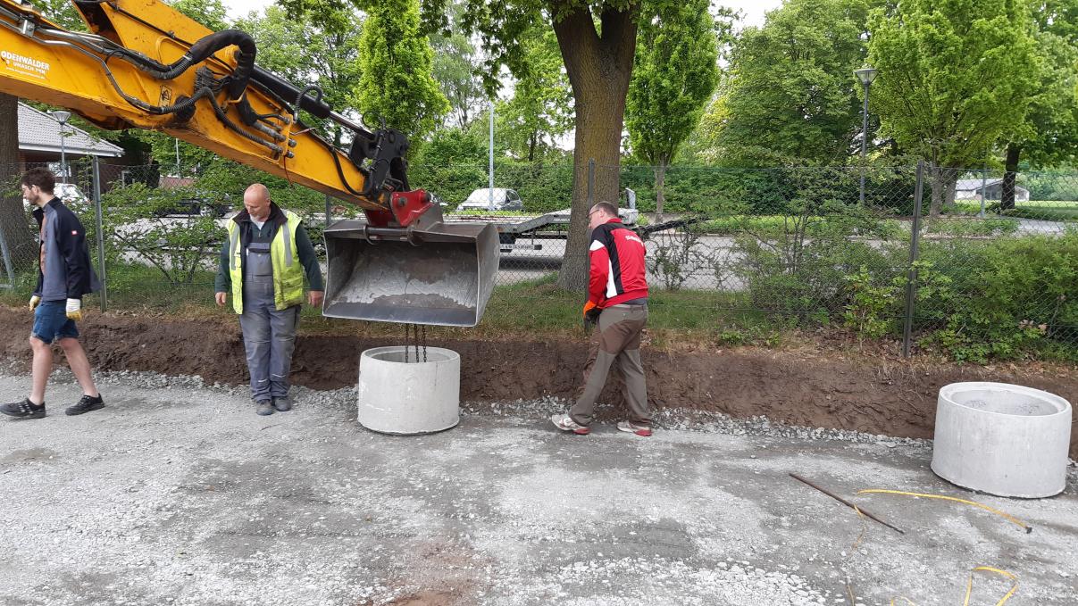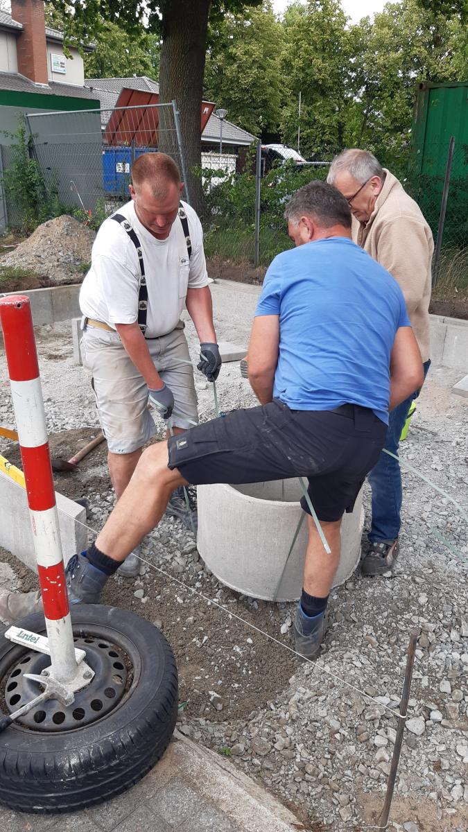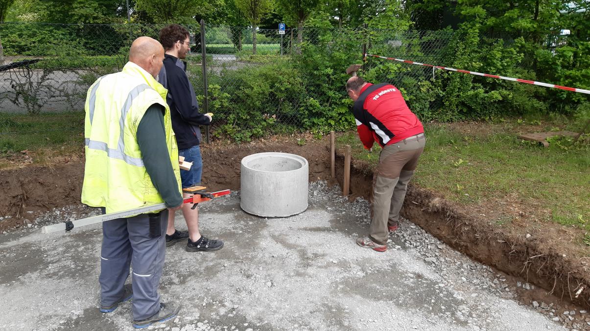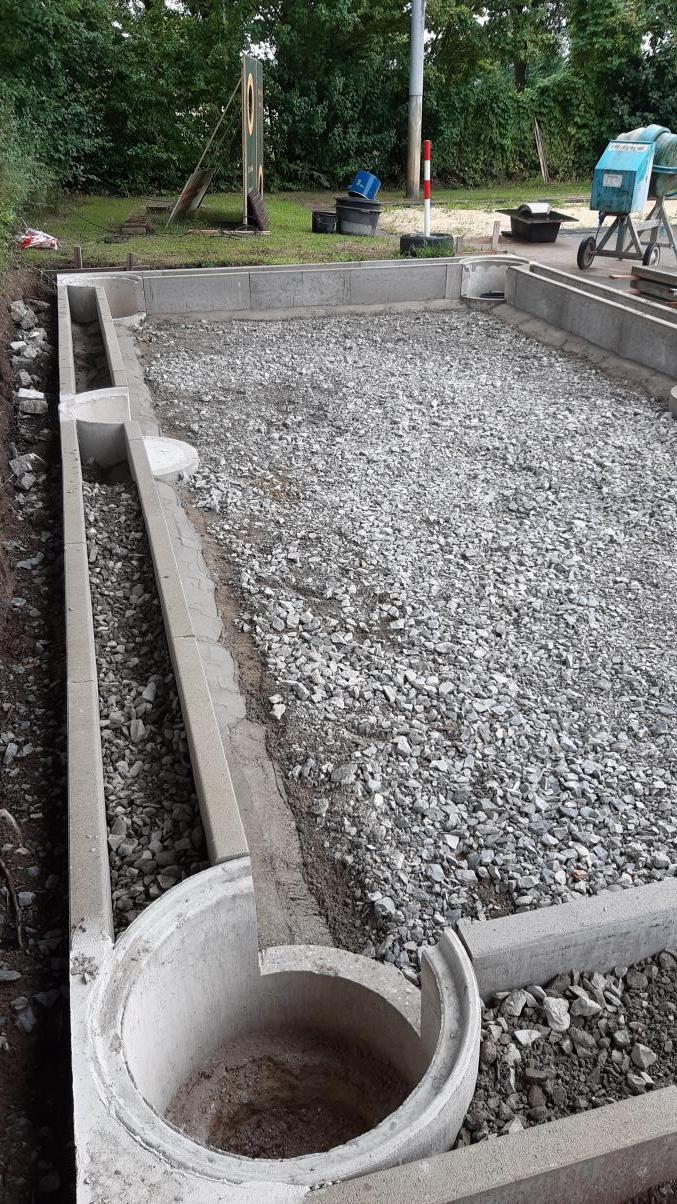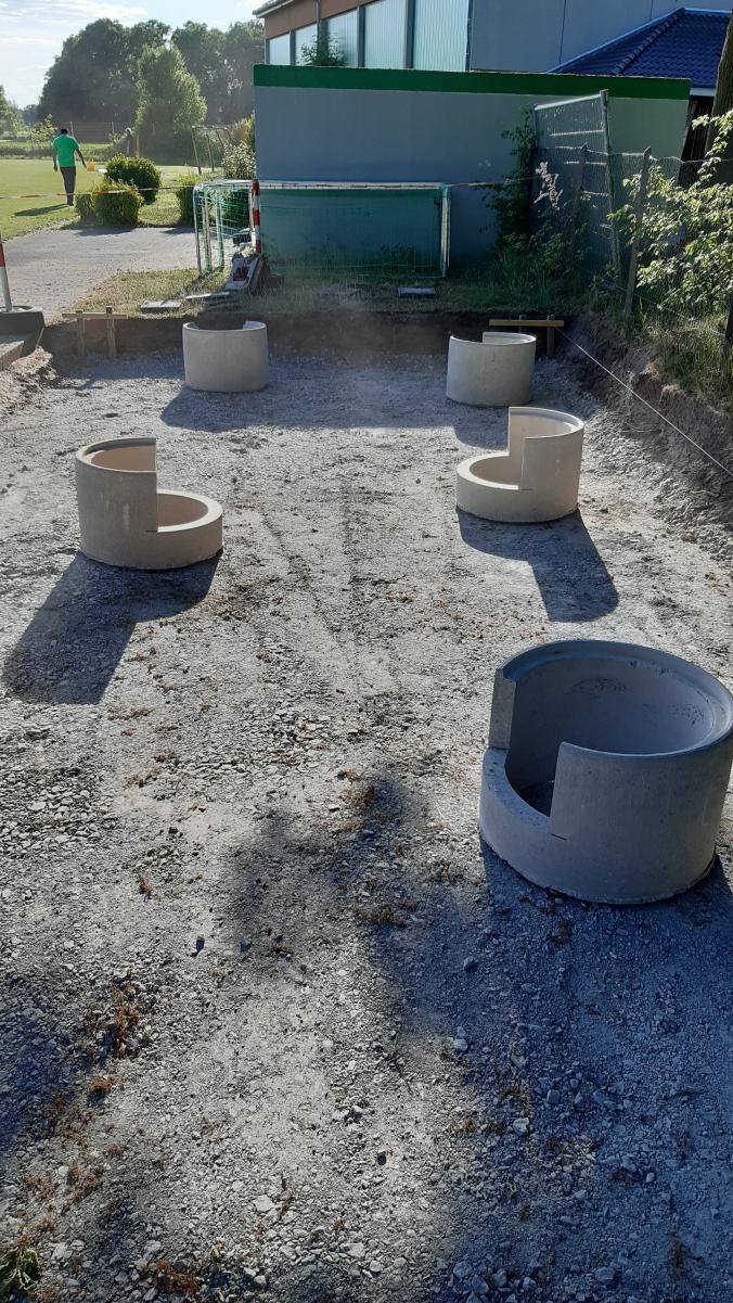 So wurde Jürgen "Teo" Steinkamp unser Experte der ersten Stunde und seine fabelhaften Einsätze haben uns im wahrsten Sinn des Wortes die Grundsteine des Projektes gelegt. Nach dem Auskoffern ging es Anfang Mai weiter mit Schottern, Rütteln und dem Positionieren der Schachtringe, welche dann später als Balltaschen zum Einsatz kommen sollten. Zudem mußten die Anlagen-Maßberechnungen in Längen-Ausdehnungen und Höhen-Verhältnissen erfolgen.