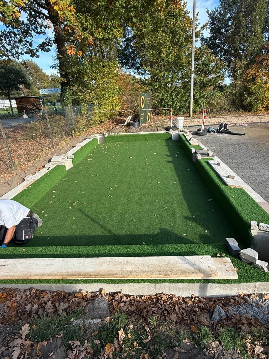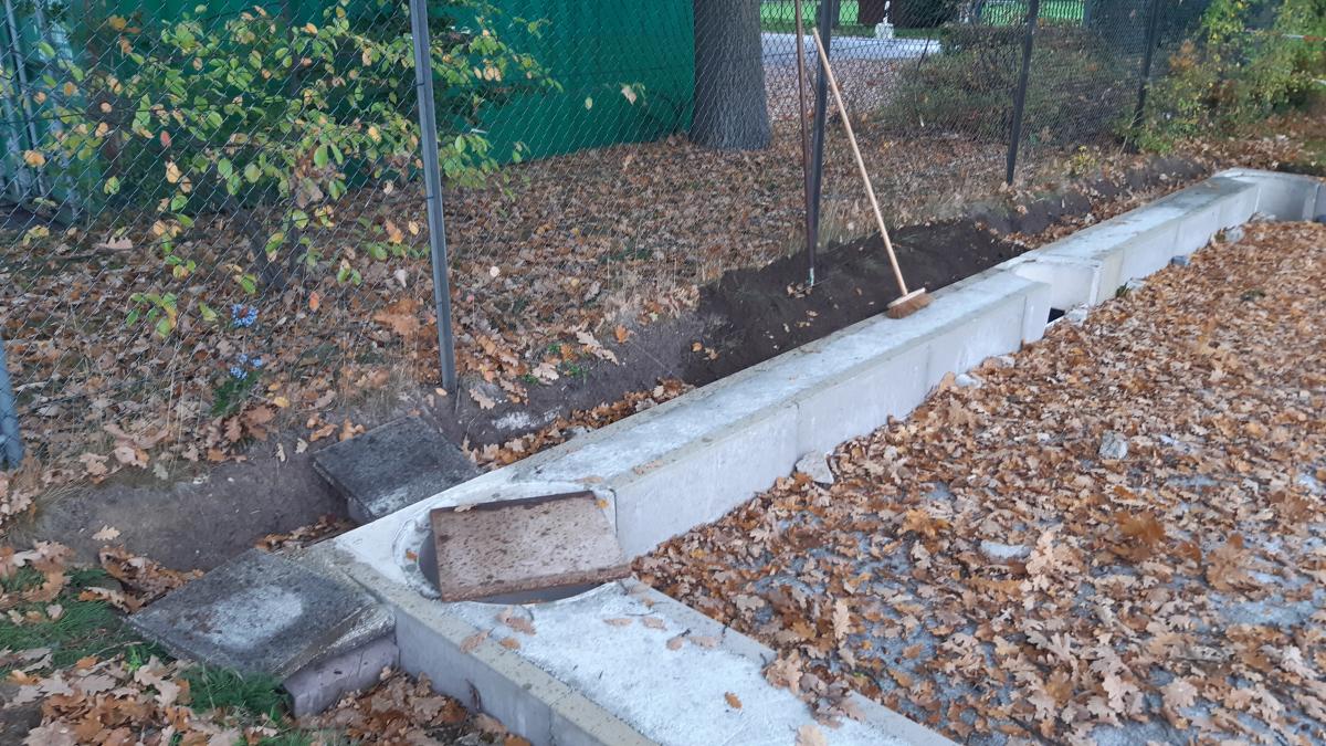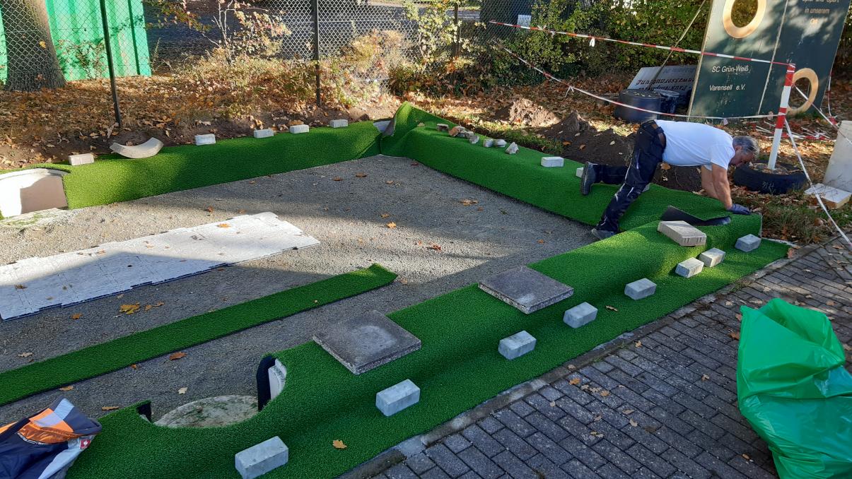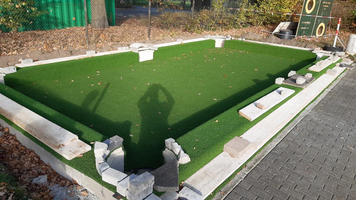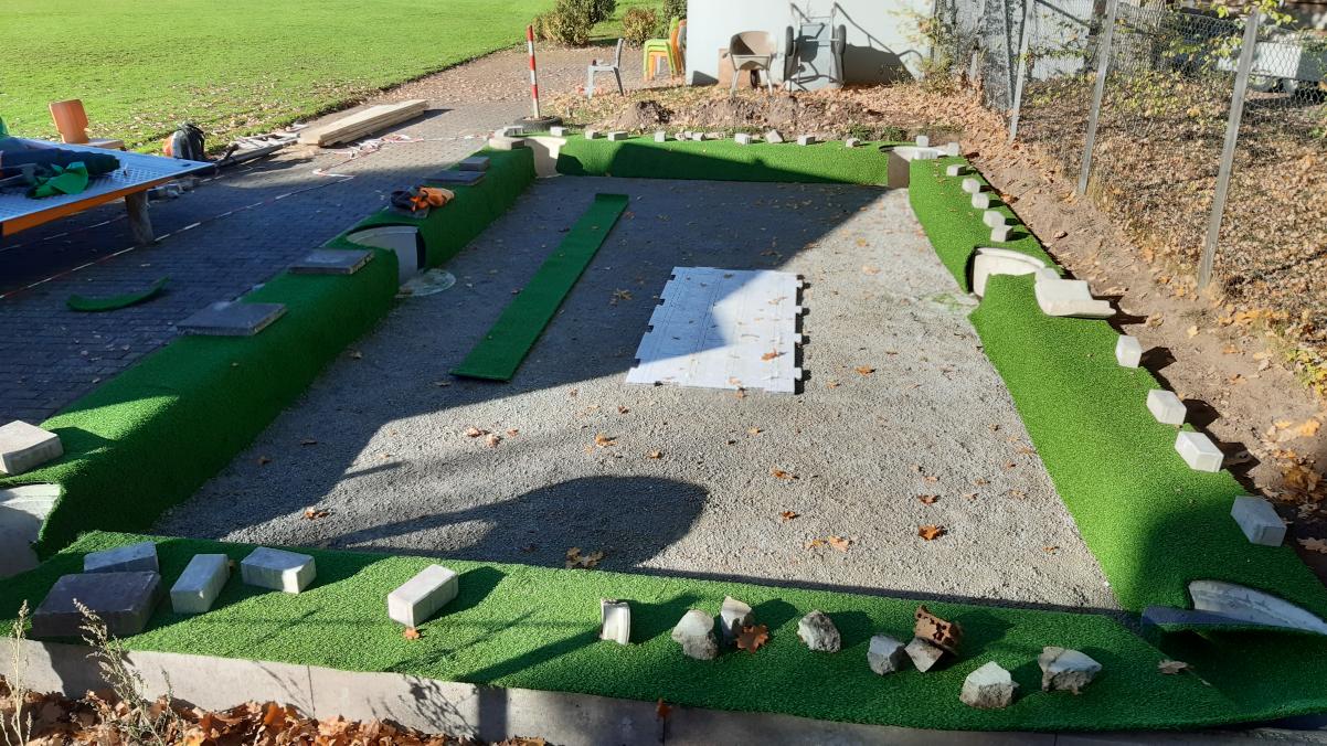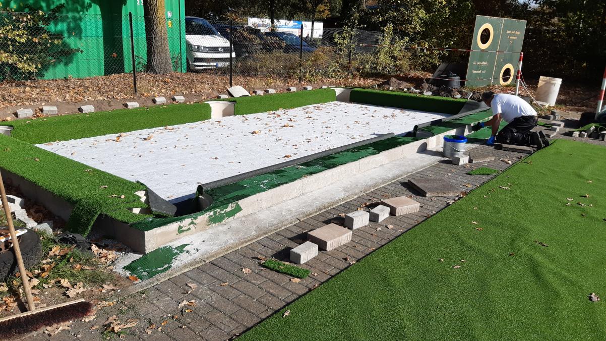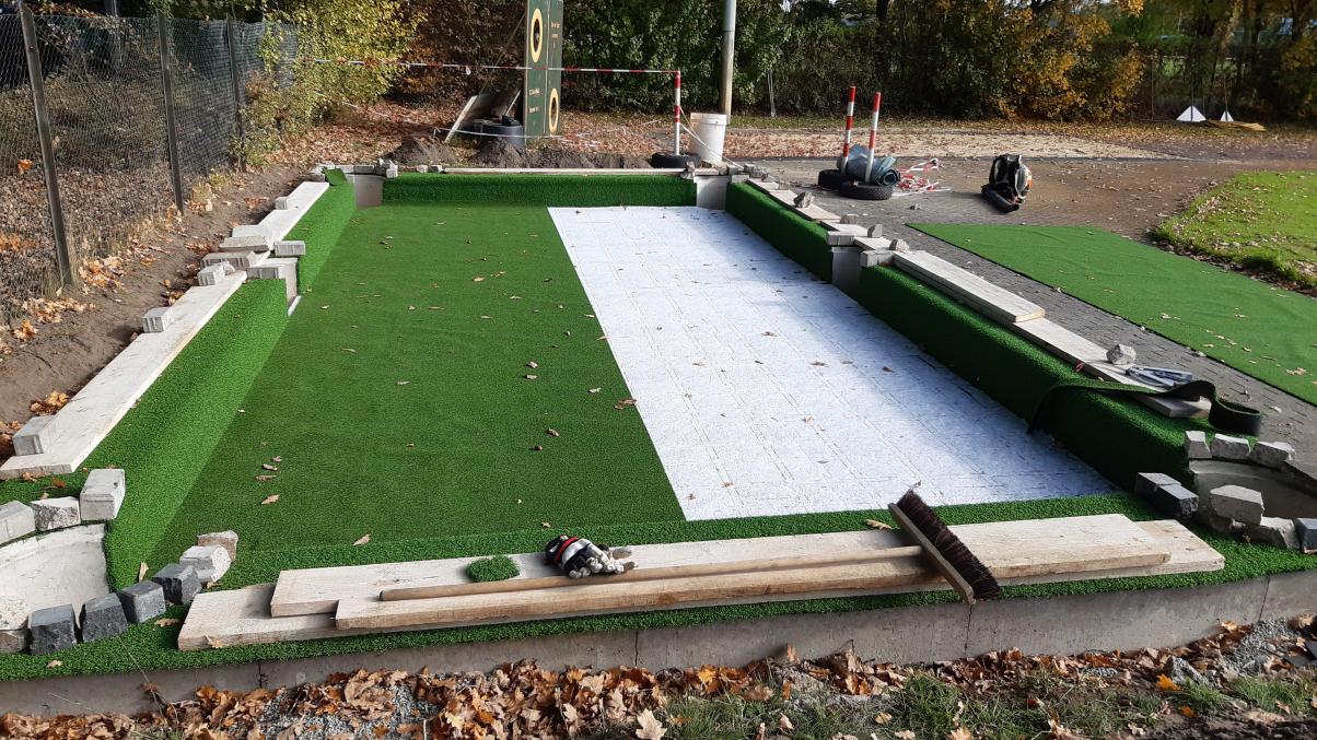 Zur Übergabe an einen Spielstart im nächsten Frühjahr sind demnächst noch ein paar Verschönerungen vorgesehen. So soll der bereits angelieferte Mutterboden an beiden Stirnseiten in die offenen Rinnen geharkt und ggf. mit etwas Einsährasen versehen werden. Außerdem sind die Taschen vom Laub zu befreien und unten durch eine geeignete Massnahme glatt zu machen. Zudem könnten z.B. auch alle runden Tascheninnenflächen weiß gestrichen werden.