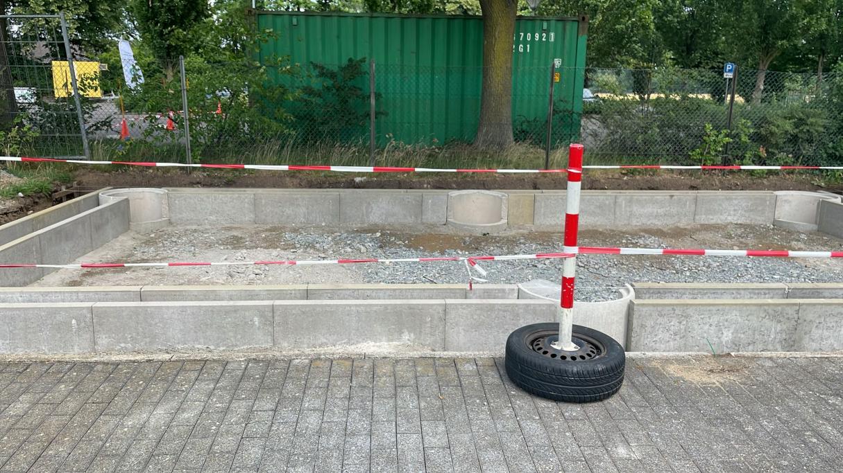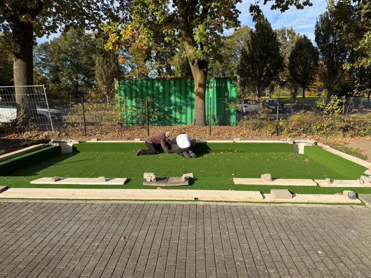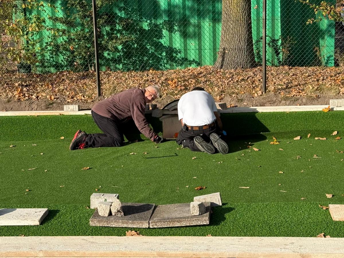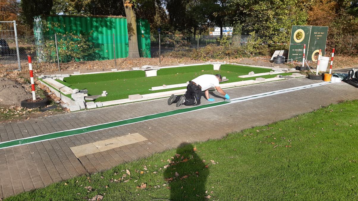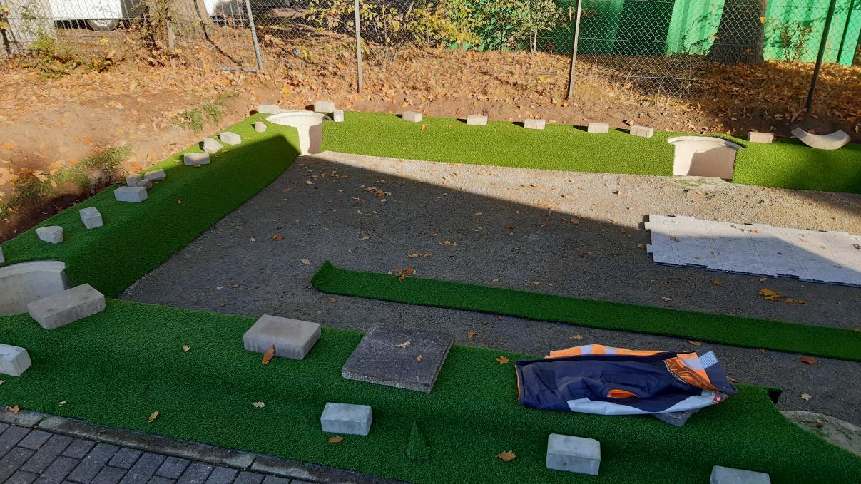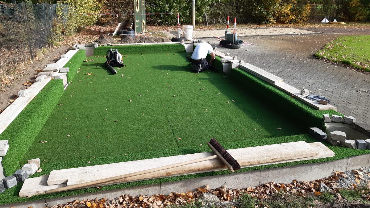 Zur Übergabe an einen Spielstart im nächsten Frühjahr sind demnächst noch ein paar Verschönerungen vorgesehen. So soll der bereits angelieferte Mutterboden an beiden Stirnseiten in die offenen Rinnen geharkt und ggf. mit etwas Einsährasen versehen werden. Außerdem sind die Taschen vom Laub zu befreien und unten durch eine geeignete Massnahme glatt zu machen. Zudem könnten z.B. auch alle runden Tascheninnenflächen weiß gestrichen werden.