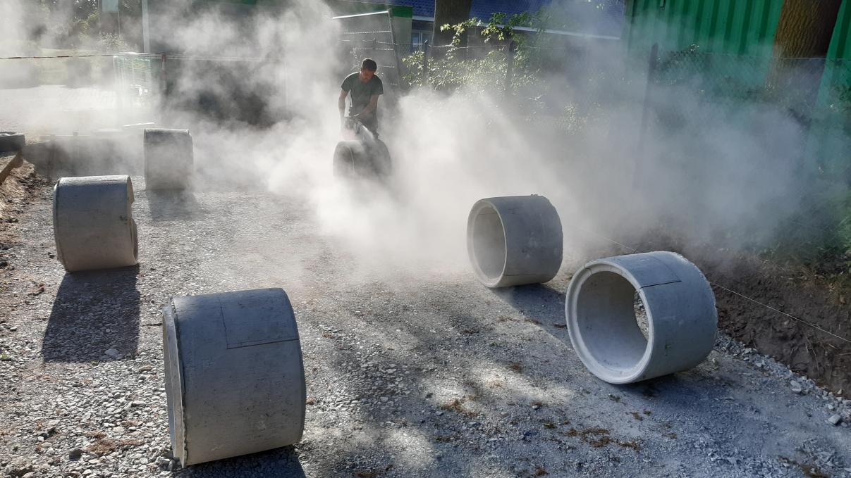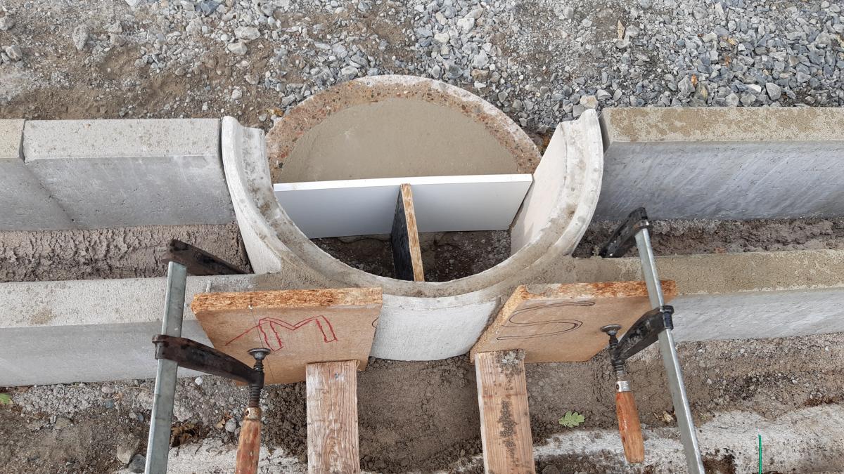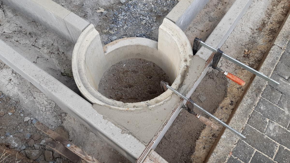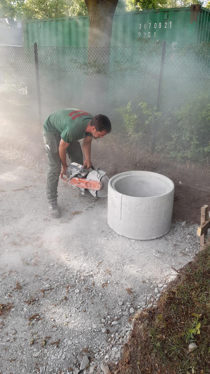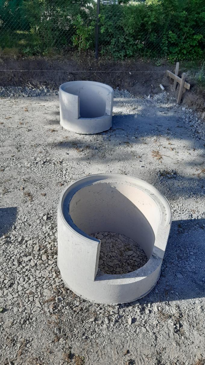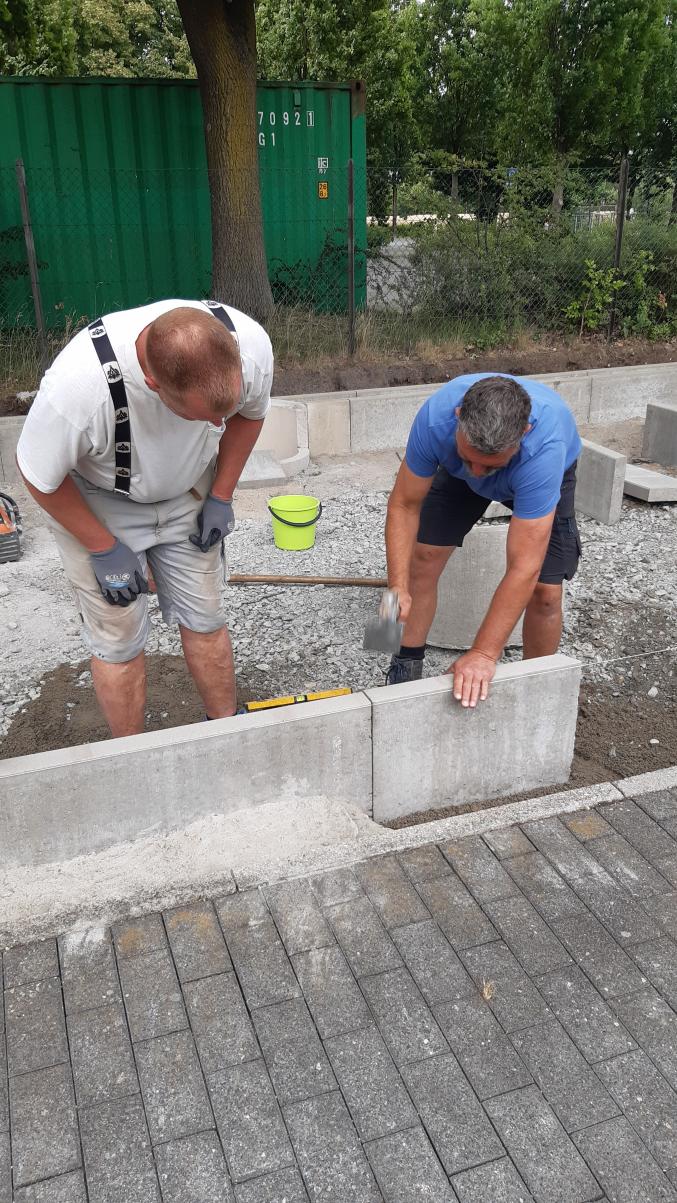 Zur Realisierung der nächsten Schritte lieferte uns Becker Baustoffe Anfang Mai Kantensteine, Wesersand und Zement. Außerdem kam in Vorbereitung zum ersten Bauabschnitt auch noch Lars Jakobfeuerborn mit seinem Trennschleifer schwer zum Einsatz, denn die Schachtringe mußten auf 4 Eck- und 2 Mitteltaschen für das "FuBaBi-Spielfeld" zugeschnitten werden.