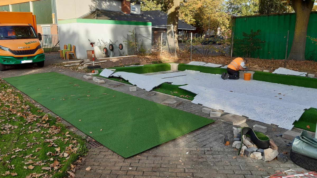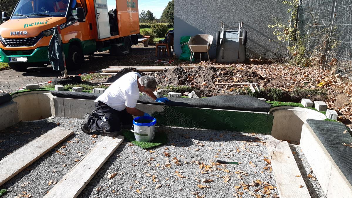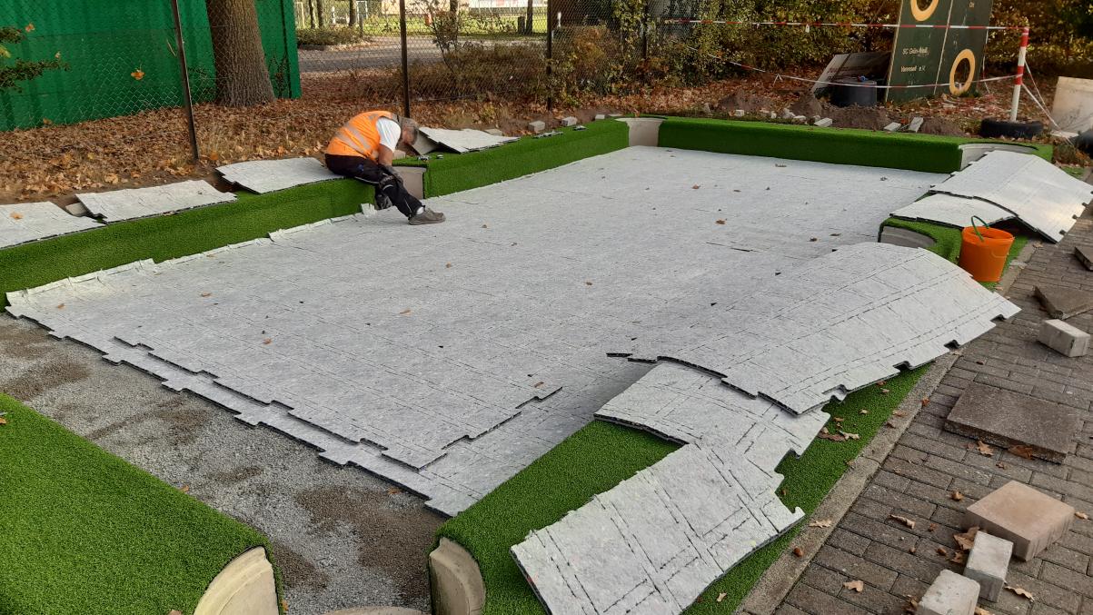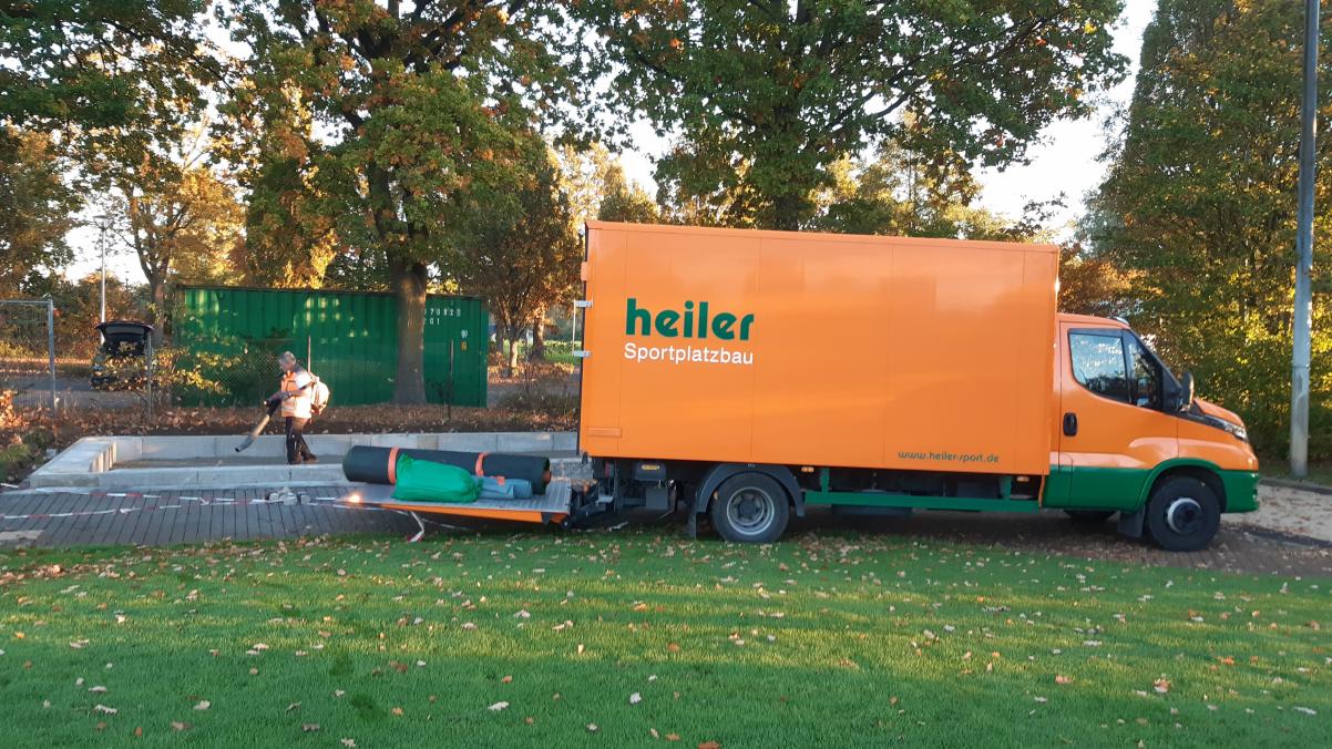 Nach diesen ersten Steps holte Oleg noch das Puzzle-Vlies aus Bielefeld, welches unter dem Kunstrasen für den Trittausgleich zum Drain Beton sorgt. Danach folgte am Sonntag der Spielflächen-Rasen.
