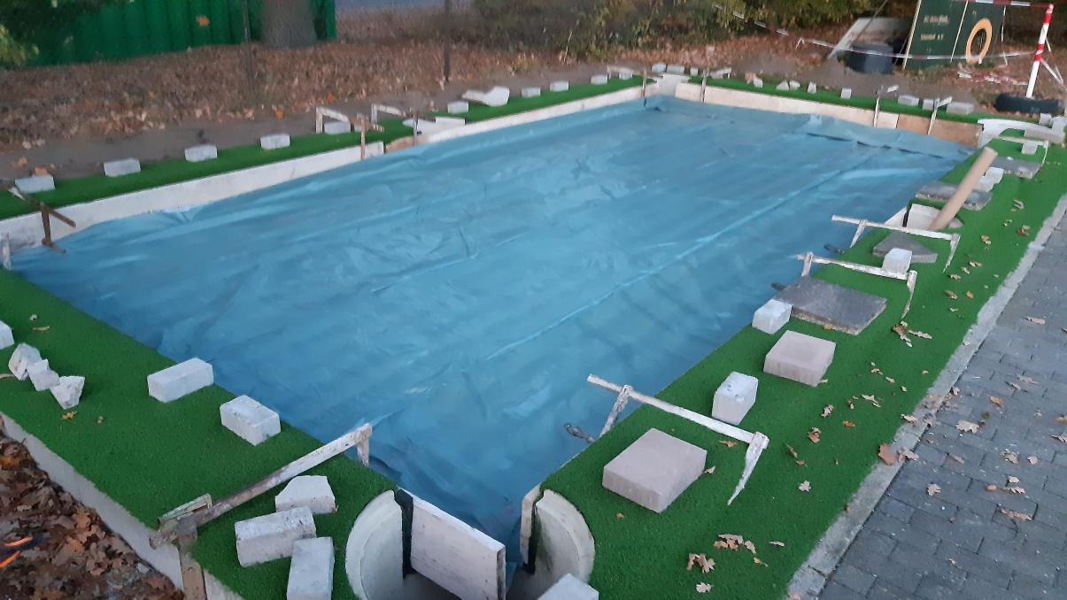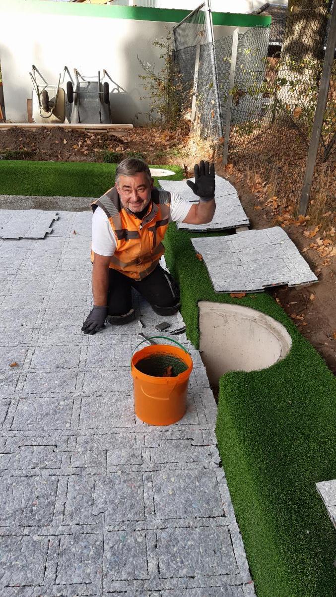 Am Sonntag Nachmittag gegen 17 Uhr wurden wir fertig mit den letzten Verlege- und Klebearbeiten, danach konnte aufgeräumt werden. Alle Außenflächen hatten noch mit Brettern und Steinen ihre Fixierung erhalten, welche am Tag danach wieder entfernt werden durften. Zu guter Letzt haben wir noch die Spielfläche "winterfest" abgedeckt.