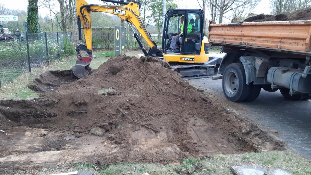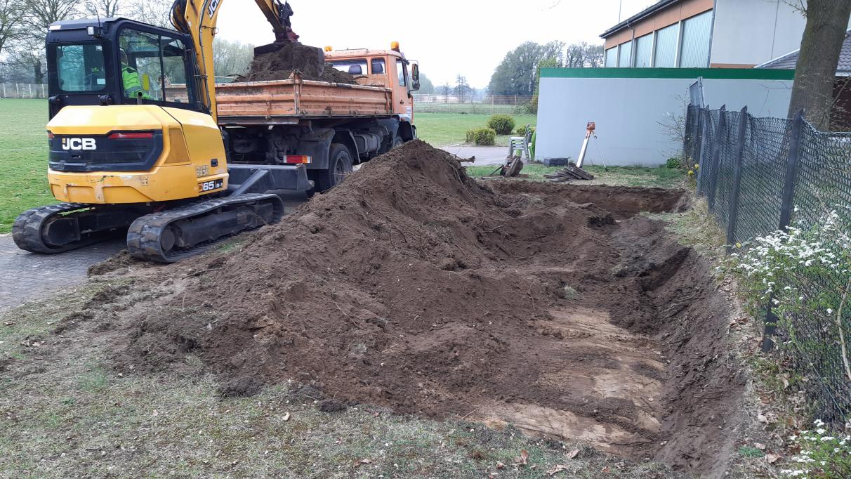 Denn im "FuBaBi-Team" fanden sich etwa 10 Ehrenamtliche zusammen, um in den einzelnen Bauabschnitten je nach Können und Fachexpertise zu unterstützen. Los ging es endlich am Freitag, den 11. April mit Teo und seinem Bagger, um die Baufläche für die Fußball Billard Anlage auszukoffern: