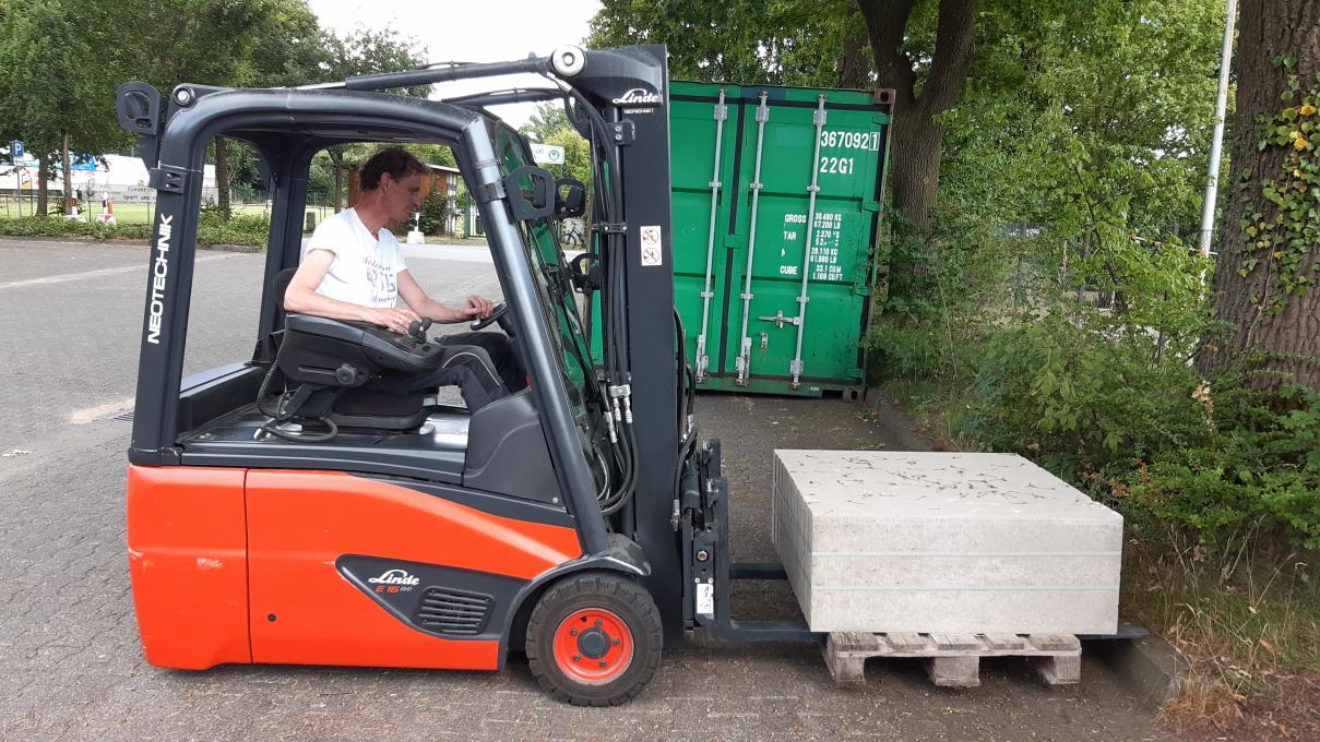 Zum Schluss blieben dann noch Kantensteine zur Rückgabe übrig. Damit diese durch Becker Baustoffe leichter auf den LKW geladen werden konnten, half uns spontan Bernd Hartkämper mit seinem Stapler, um die Palette auf dem Parkplatz bereit zu stellen.