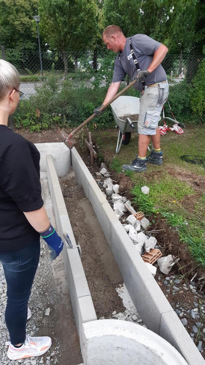 Die ersten Julitage vor den Sommerferien mussten wir dann wieder in kleinerer Besetzung die Restarbeiten zur Kanten-Begradigung fertig stellen, damit das später gut mit Kunstrasen beklebt, und die Umrandung weiter mit Schotter aufgefüllt werden konnte.