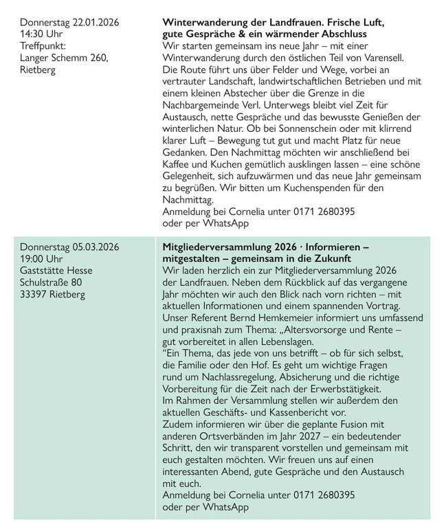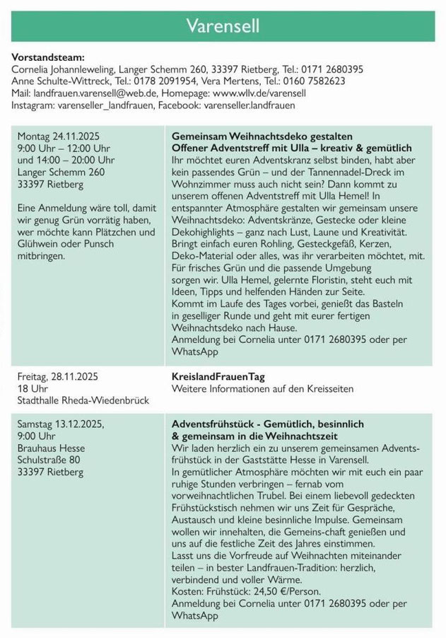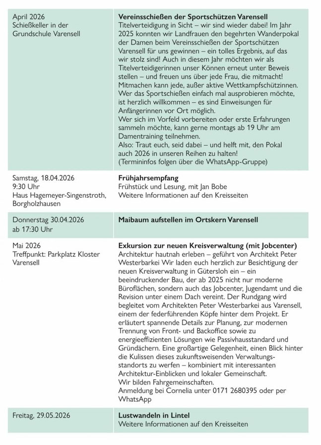 Die Landfrauen GT haben ein neues Jahresprogramm 2025-2026 veröffentlicht, welches nachfolgend auszugsweise durch Cornelia Johannleweling für den Varenseller Ortsverband 2025 bekannt gemacht worden ist (s.u.).